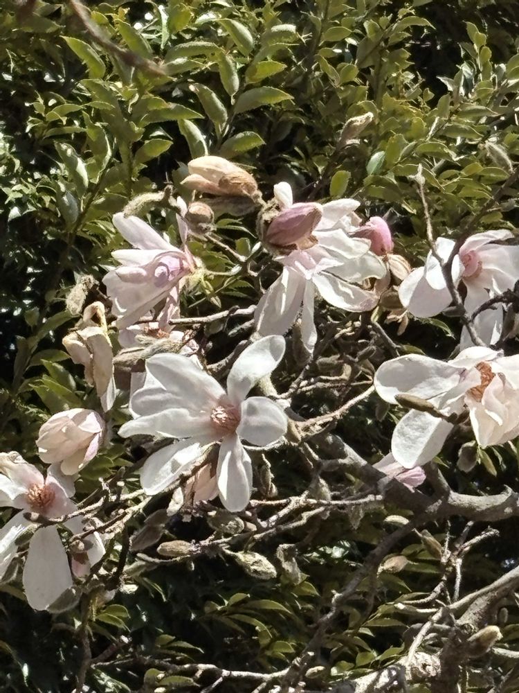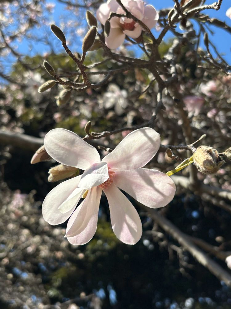 今日のお花コブシ、さっき見てきました。①後ろから見ると、花びらの基部に小さな若葉が1枚ついているのがコブシの特徴だそうです。②モクレンと比べて花があっち見たりこっち見たり賑やかですね。③花弁は6枚らしいのですがこの花は何なのかしら?