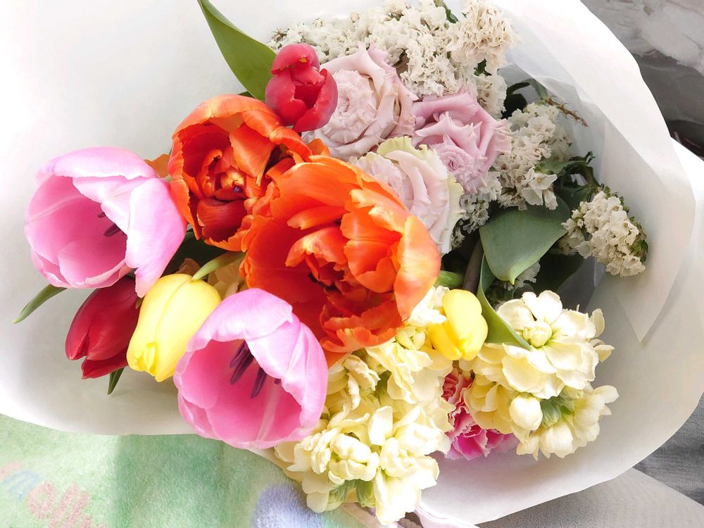 春色のお花を持って