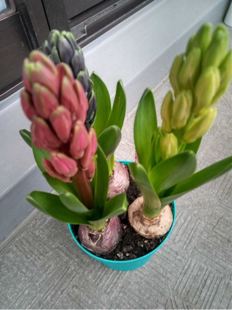 この時間まだ、ひんやりとしていますが、午後から気温上昇するとの事、外出時の服装に迷いますね、ベランダのヒヤシンスが今にも咲きそうです。