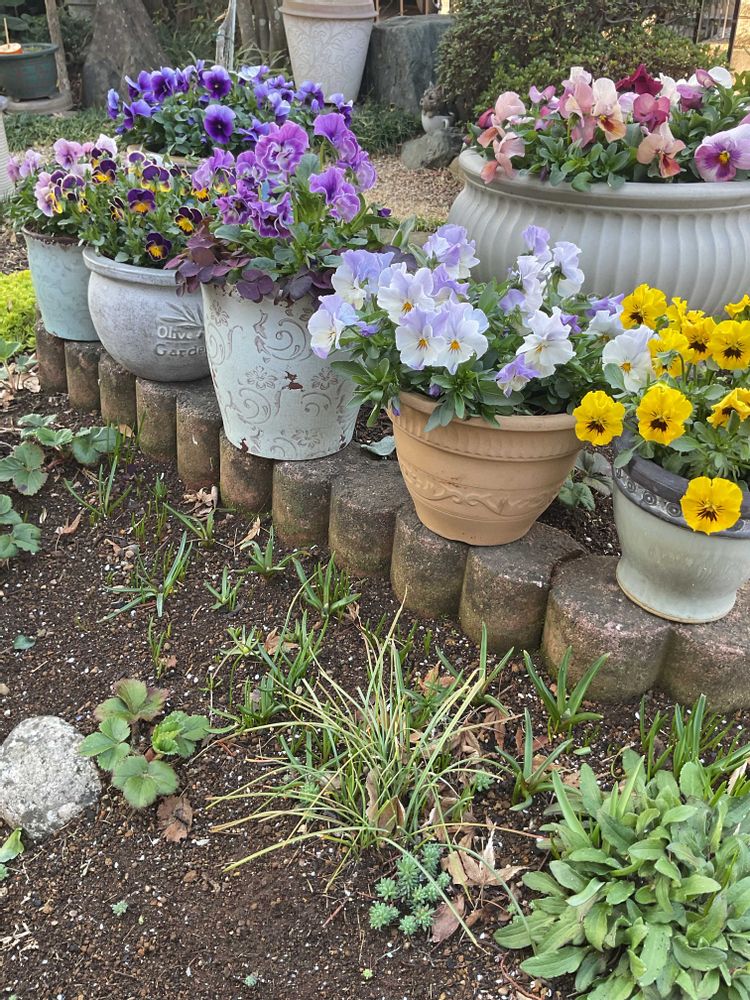 花壇のブロックの縁に、パンビオさん達の 小鉢を並べてみました〜❣️