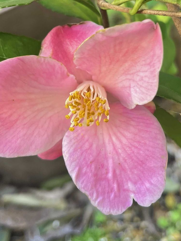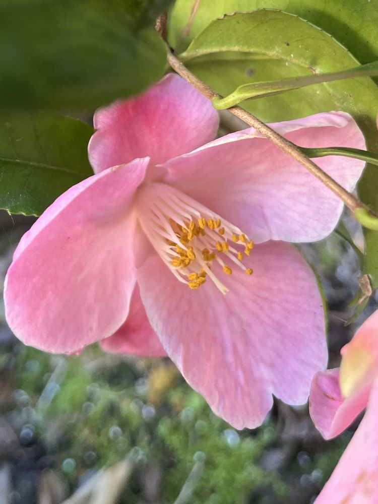 椿・港の曙💕地植え組。成長がかなり遅いので、這いつくばって撮るのがタイヘン💦