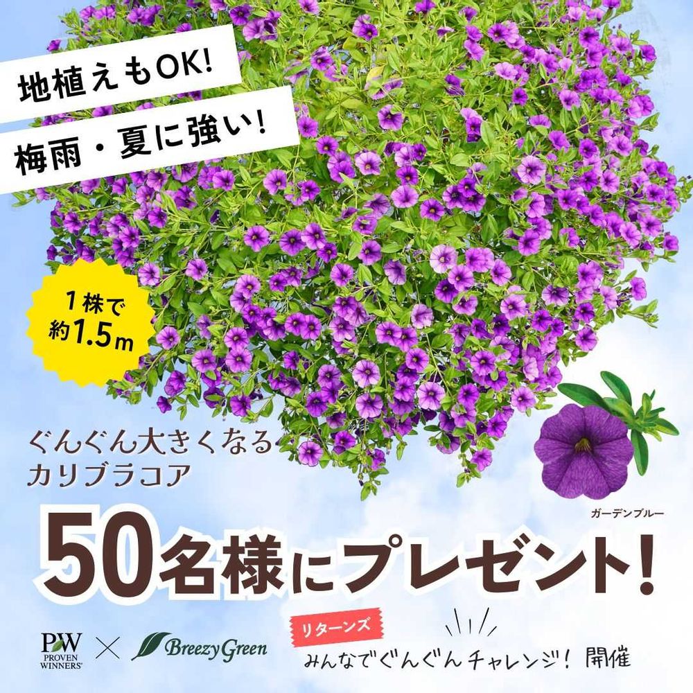 「ぐんぐん大きくなるカリブラコア」と言えば、地植えでOKの1株で1.5mに育つ今までにないカリブラコア♪今年もみんなでぐんぐんチャレンジしてみませんか?今回ぐんぐんチャレンジいただける方50名様にプレゼントします。