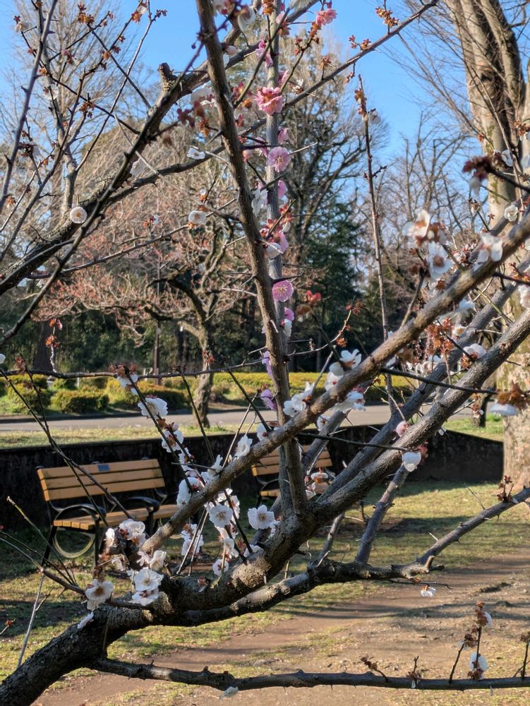 近くの都立公園で、今年も同じ木にピンクと白2色が咲いている梅、春日野を見ることが出来ました。