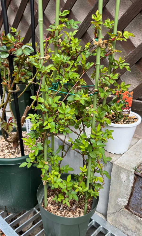 「ミニバラは、つる性じゃない品種の場合は、背丈を高く仕立てても枝が細くて水分や栄養を枝の先まで送れないからよした方がいい」…とのことだけど、樹勢が物凄いのでつる仕立てでもいけるのではないかと思い、冬剪定の際にこのように仕立てました。