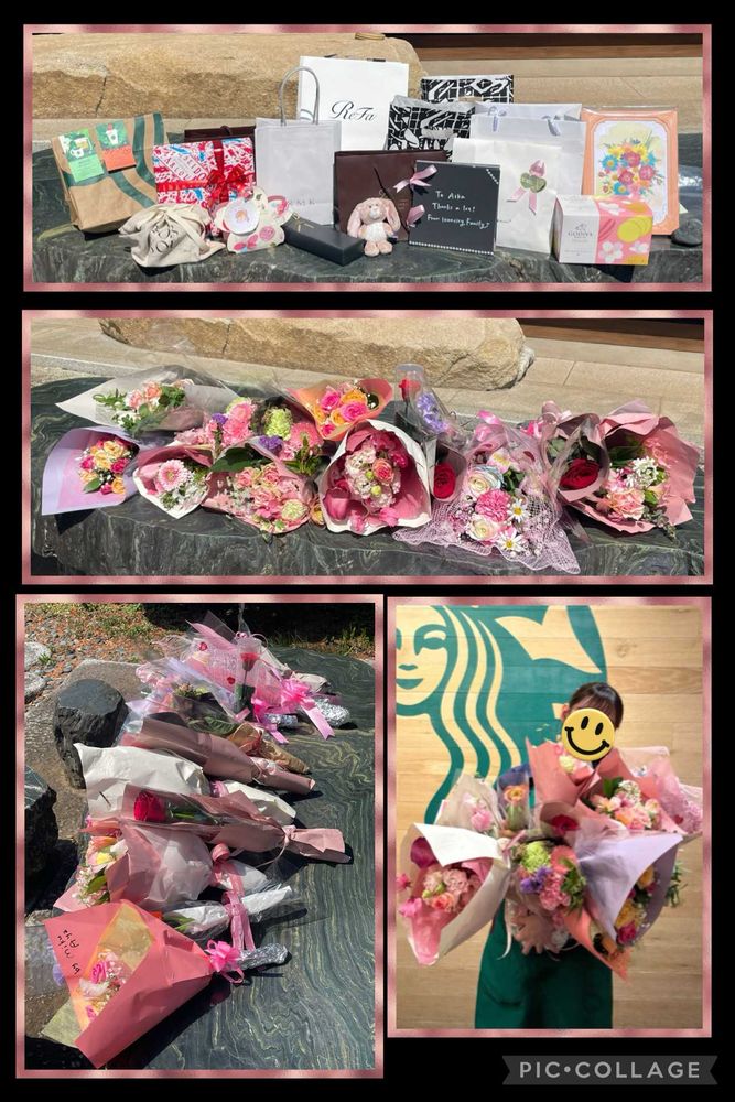 私でさえ、生きてきてこれだけの花束を一遍に頂いた事が無いです。娘のアルバイト先、スタバだったのですが辞める時、他のアルバイトより盛大な感じがします。最終日は、こういったプレゼントを持って来てくださって、一緒に写真を撮ったり 女優さんですか?って扱いになっていました😂他にこの日、3人辞める子がいたのでバックヤードは花束が凄かったらしいですよ。大変な事もありましたが4年間続けて良かったと思います😊