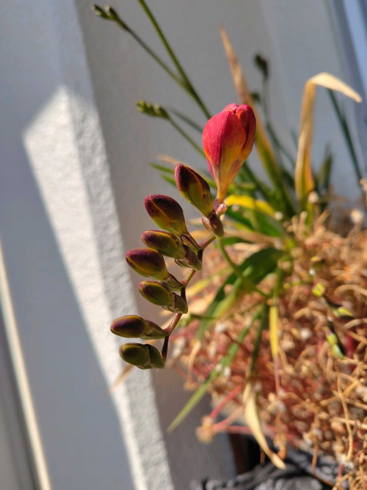 2pic目は、フリージアさんの大きなつぼみです。赤いコと黄色いコがいるのですが、今年は赤いコが先に咲くようです。