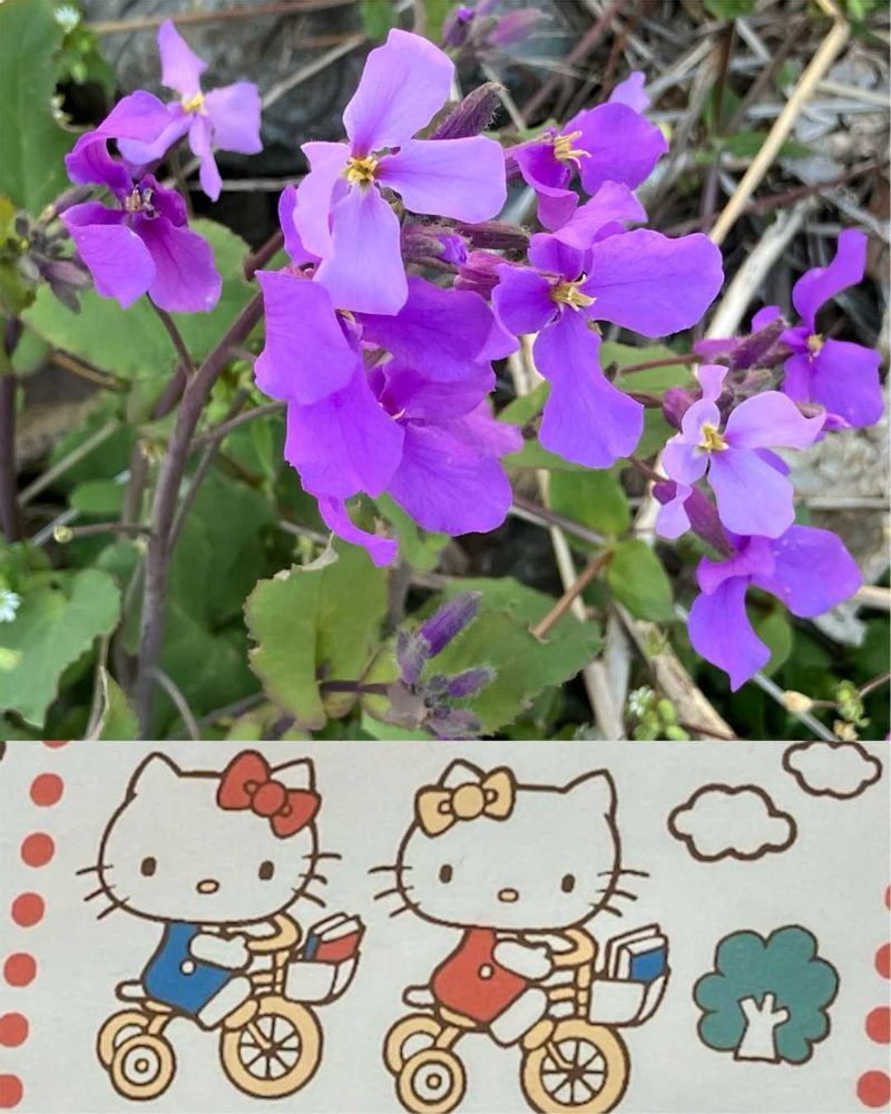 ①ムラサキハナナと孫ちゃんの枕のキティちゃんで☺️