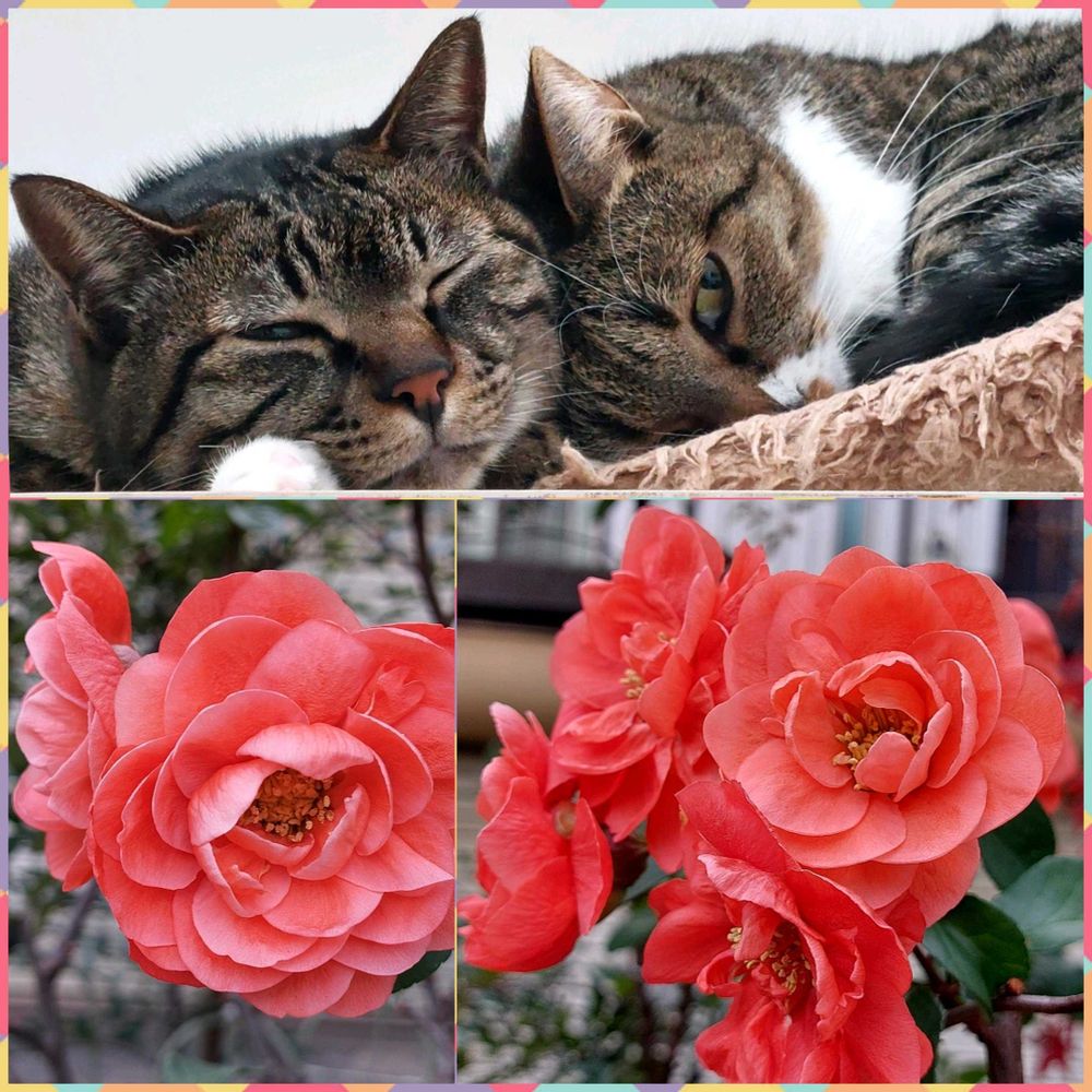 シマちゃんとモモちゃん 仲良くくっついて寝ている姿に癒されますねぇ〜🐱🐱🥰💕🍀💓愛しいです☘️