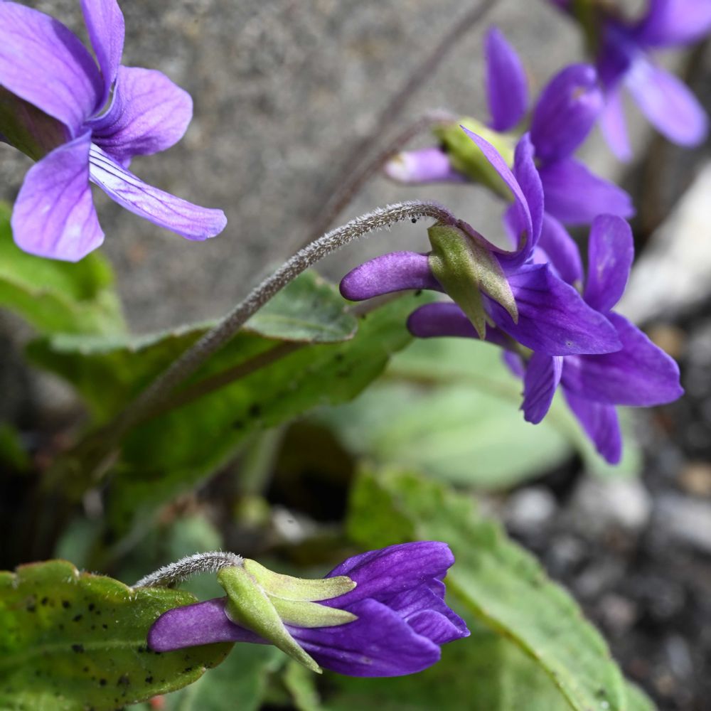 花は青みがかった紫色で、中心部が白く抜ける。側弁基部はふつう無毛。