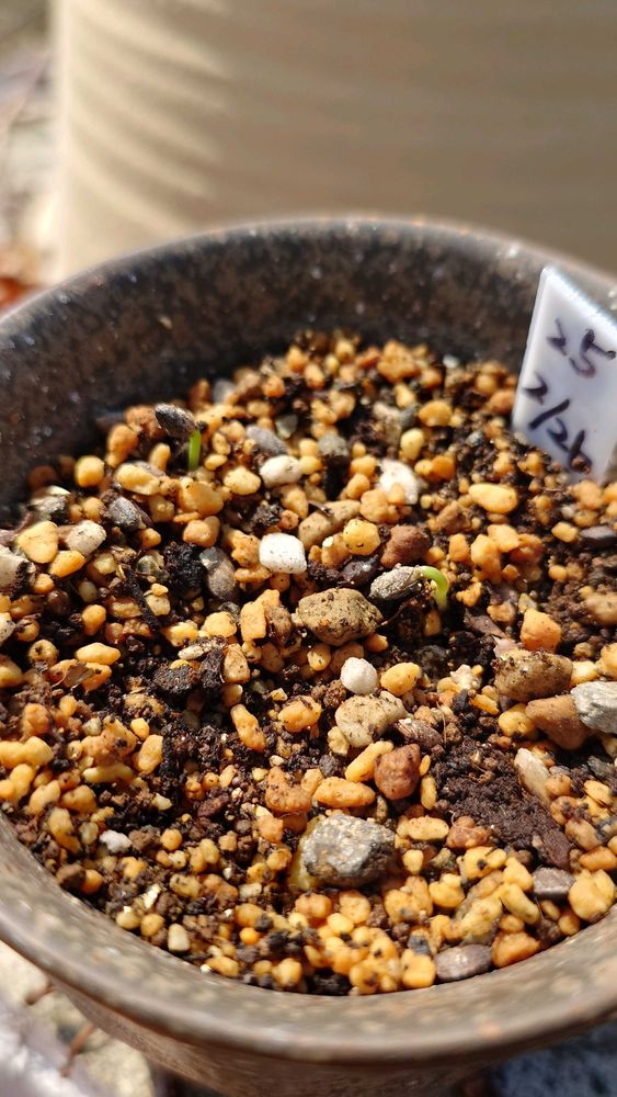 数日前窓辺に引っ越しさせた黒松の種蒔き鉢から 待望の芽