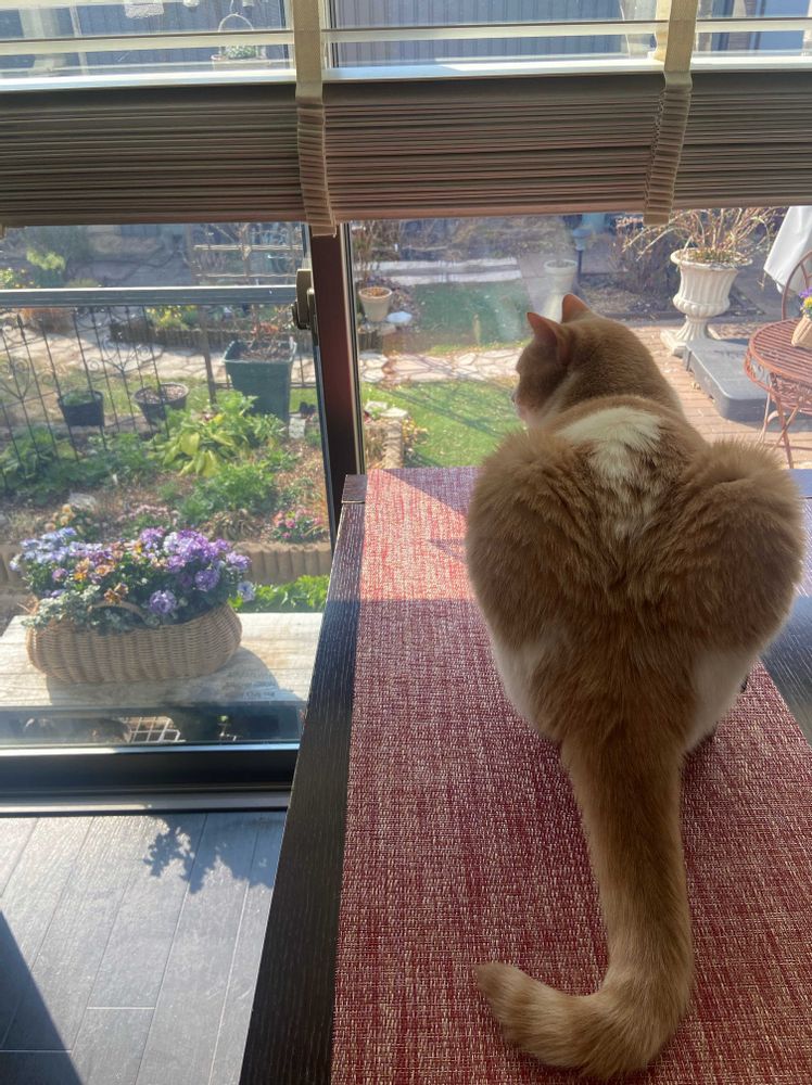 ののちゃん🐱特等席でお庭が見れて羨ましいな〜😁