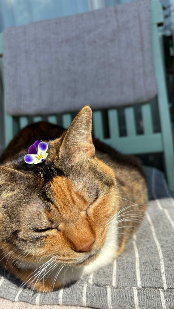 ベランダで日向ぼっこしている時に写真撮る時は何かお花を頭に載せて、女の子アピールしちゃいます🎀