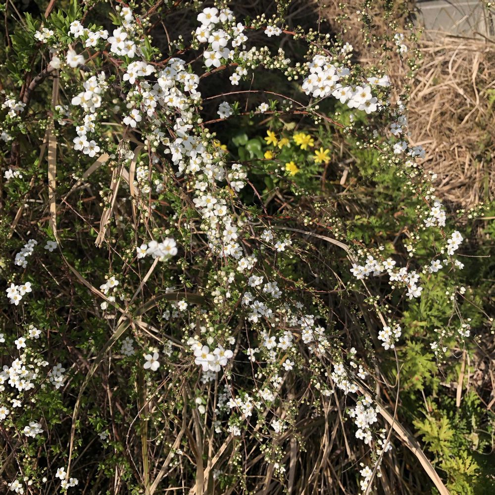 4枚目:5分咲きくらいのユキヤナギと、その隙間から見える北のヒメリュウキンカ。