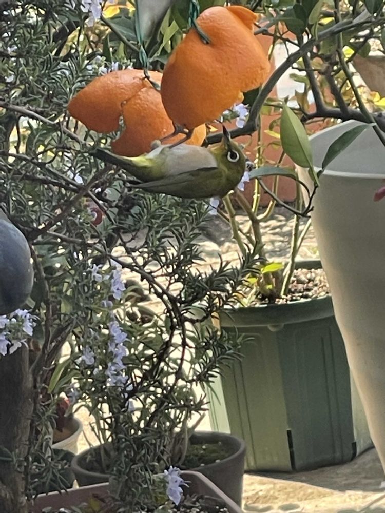 今朝もローズマリーの枝先に吊るしたせとかの実にメジロちゃんがきてくれました🙇♂️🙏😊😭