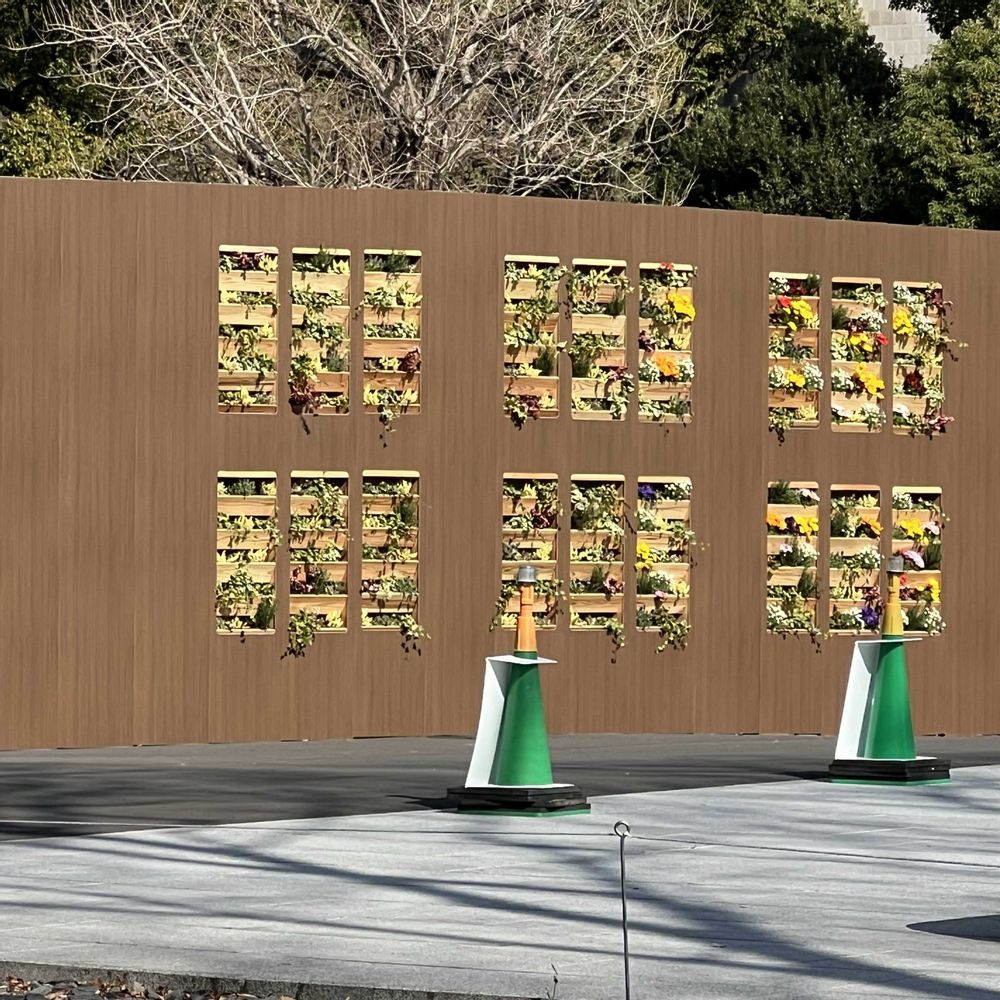 中は工事中 囲ってある塀に素敵なミニ花壇が沢山ありました
