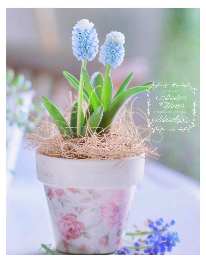 下から青い花、鉢のデザイン、そして主人公のムスカリさん、計算された構図💕