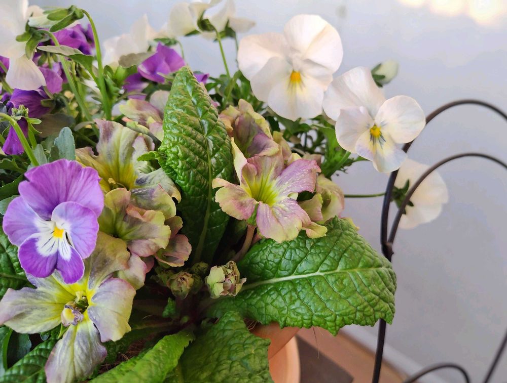 の寄せ植えです。プシュキニアは隠れていますが、もうすぐ咲きそうです。見元園芸さんのプリムラ マーベルグリーンは、緑と青が混じったような色が素敵です!