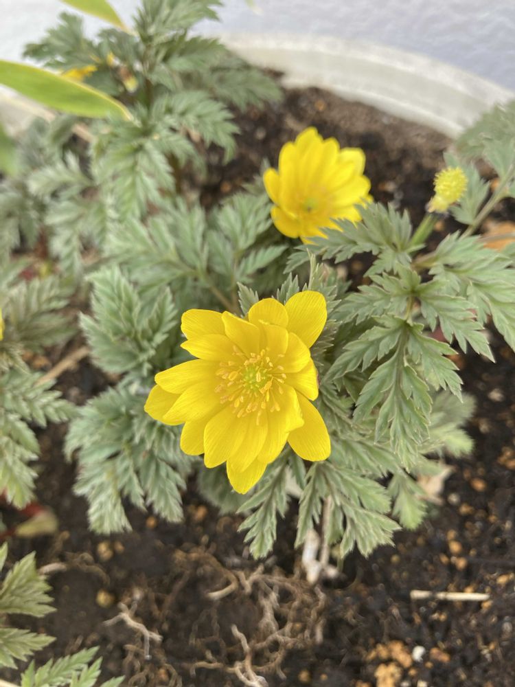 実家の鉢植えの「フクジュソウ」がやっと咲いた。
