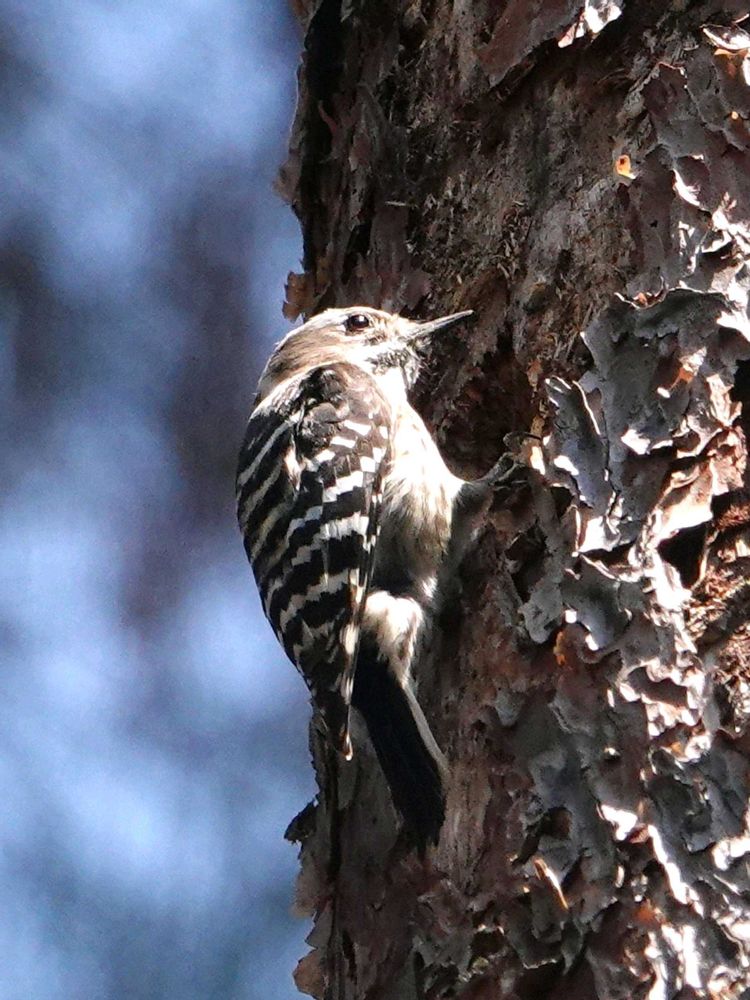③ 枯れたアカマツの幹をつつくコゲラ~控えめなドラミングの音が聞こえて来ました‥🐦⬛