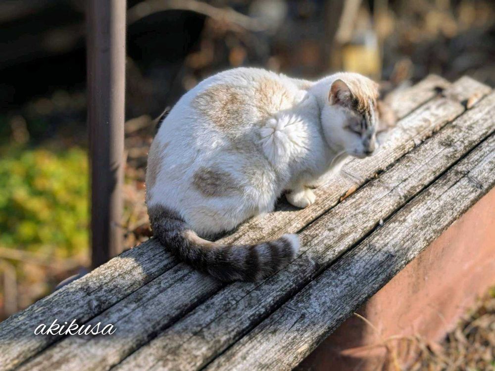 それがね〜 最近チロは家の中で暖かく過ごしていることが多くて たまたまデッキに出ていて私が庭に下りてもなかなかついて来なかったんです この時はデッキ前の(廃物利用の💦)ベンチに出て来たので写せました
