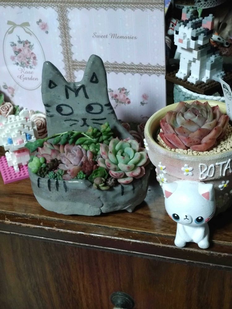 猫ちゃんの鉢🐱陶器かな?可愛いね〜💕寄せ植えWS楽しそうでいいなぁ〜♬.*゚
