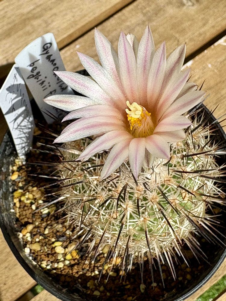 黒、白、緑でなんだかカラフルなギムノカクタス。和名は白狼玉。花はギムノカリキウムに似ている。