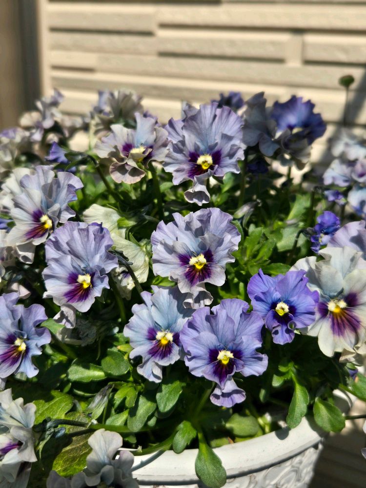 6cmポットで育てた苗を5つ、6号鉢にまとめて植えたら、色とりどりのマリア様が溢れるように咲いてます🌼