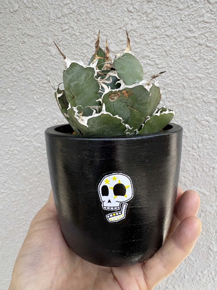 数年前にハマってたリメ鉢の道具が捨てずにあったので、セリアで100円プラ鉢買って、カッコよくブラックに塗り、スカルのデコパもやってみました。