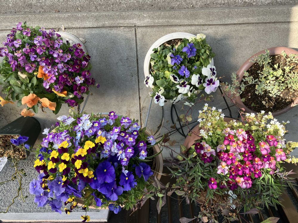 我が家玄関先の冬越し寄せ植え達です!良く氷点下耐えてくれました✋