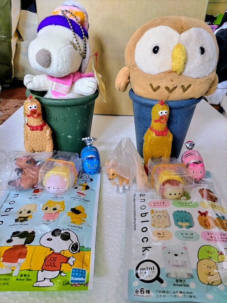 私からは左の🅰️スヌーピーset …スヌーピーぬいぐるみ、緑のプラ鉢、にぃさん、ブロック、ジュエリーベコ💙その他