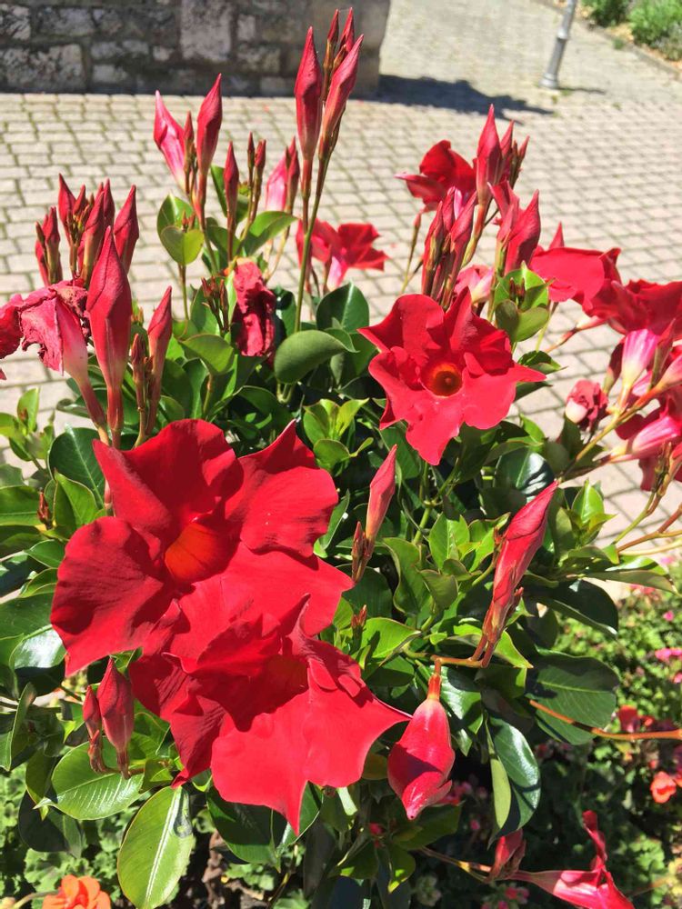 この花は、南仏でもよく見かけます❗️夏の花ってイメージです❤️ GSの投稿で見たサンパラソル⛱という花も同じ種類だと思います◡̈♥︎和名はマンデビラでした❣️蕾がパラソルみたいですね❣️
