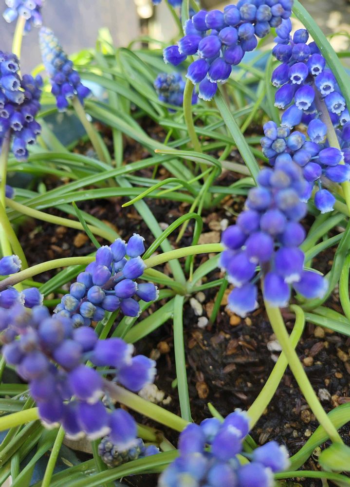 ②綺麗に並んでいるのは最初だけで、すぐにあっちこっち好きな方向にあばれる君のムスカリさん。葉っぱはラーメンみたいに伸びちゃうから花の後球根を掘り出して、12月頃植え直ししましたが、また伸び放題になりました😭私にはムスカリはムズカシイ😓