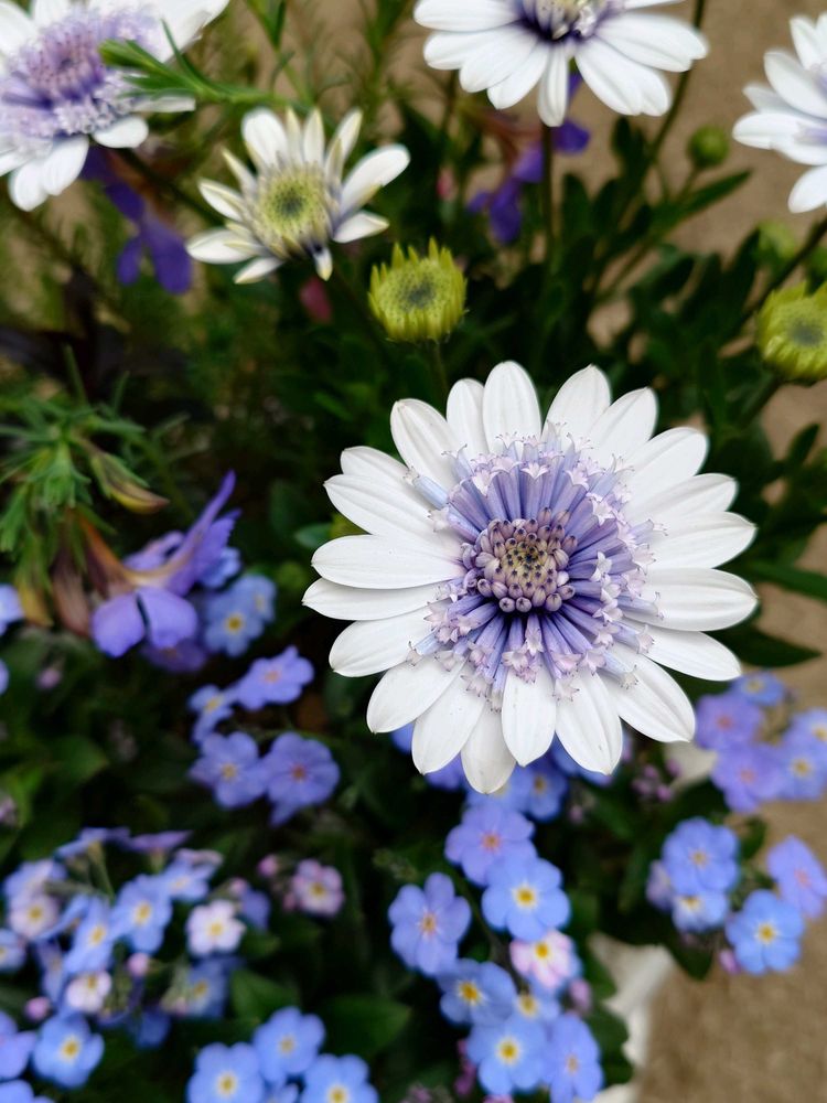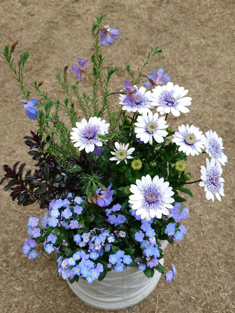 オステオスペルマムのシルバーナイトを使って、ブルーの寄植えを作りたく、やっとお花屋さんへ行き作ることが出来ました✨