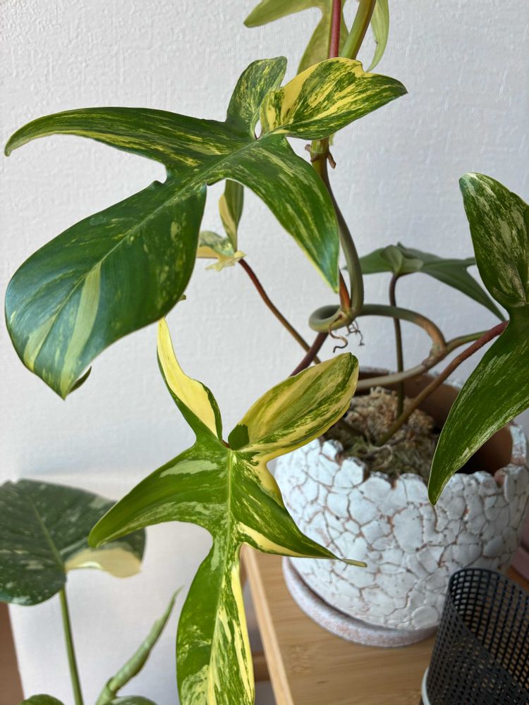 2025.8月に某サイトで購入した【アロカシア チャイ】の 突然変異?なんだろう 購入時、元々有った葉を(1枚目の葉)として、 下から新たな葉が出てきてる状態で到着しました(2枚目の葉) こちらに来て初めて出てきた葉に異変が。。 育て始めて出てきた初めての3枚目、4枚目 (途中から、斑1、斑2、、と続きます) どこまでこの謎の斑入葉が続くのか、 いや止まるのか……記録していきます