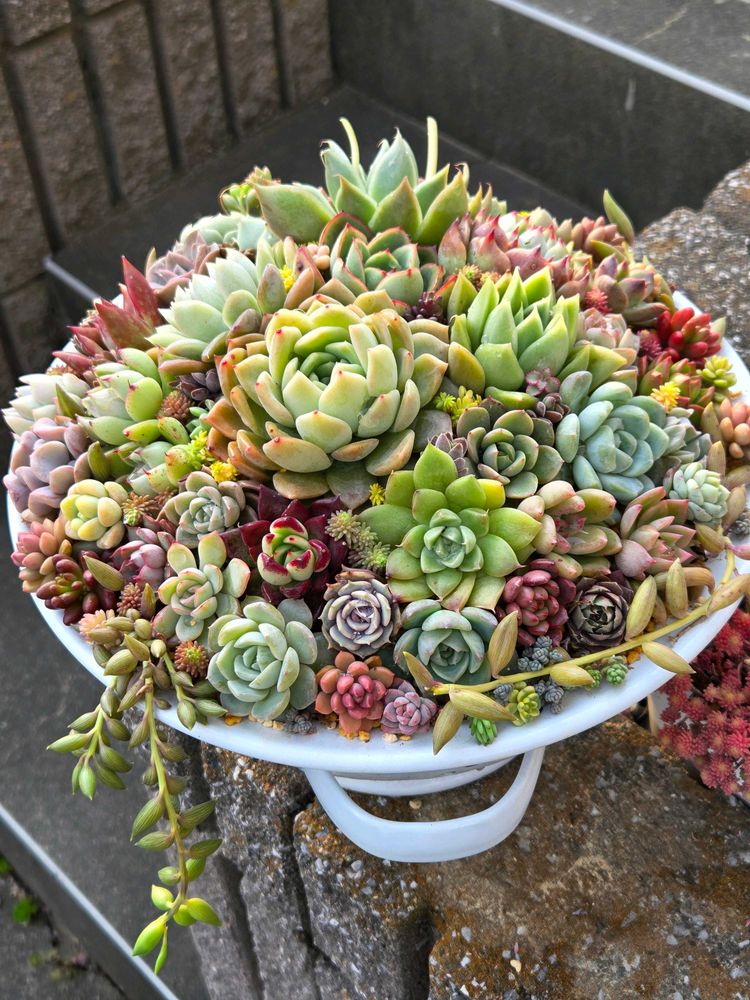色とりどりとても可愛く出来上がってますね。買ったら1万以上は、するでしょうね。挿し芽して育てた多肉ですか?それとも今まで植えてたのを切る✂寄せ植えですか?私今花粉症ひどく鼻水咳が、止まらず病院金曜日行ってきました、年を取ると治るのが遅い。体調悪いから多肉伸び放題、早く寄せ植えしたいのに、これ以上酷くなると来月旅行行けなくなるし買い物も行けない、小さな庭は、ビオラアリッサム花かんざし色々綺麗に咲いてる。花に水をやるのも大変です。たまに主人してもらってる。