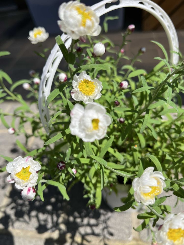 この暖かさで花かんざしが開花しましたー。白くてかわいい花ですねー。