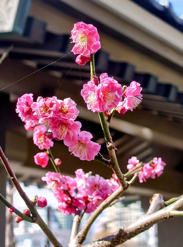 今日の午前、市内を散歩途中に見かけた紅梅。