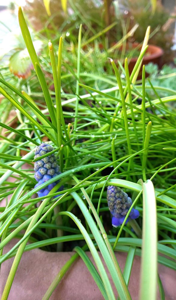 ①プランターのムスカリが頭を出していました。