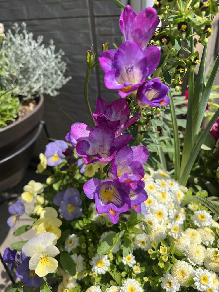①一昨年の秋に寄せ植えをした紫のフリージア