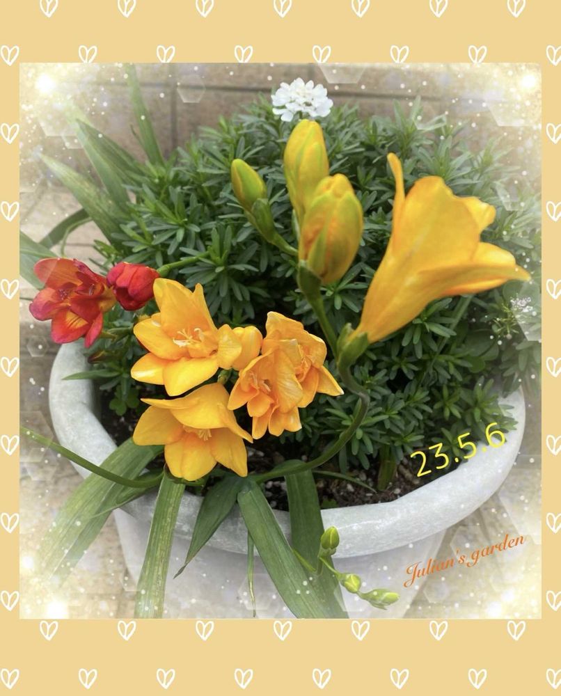 ①八重のフリージア 混合の球根をイベリスと一緒に植えて 出て来たのが黄色と赤でした💛❤️