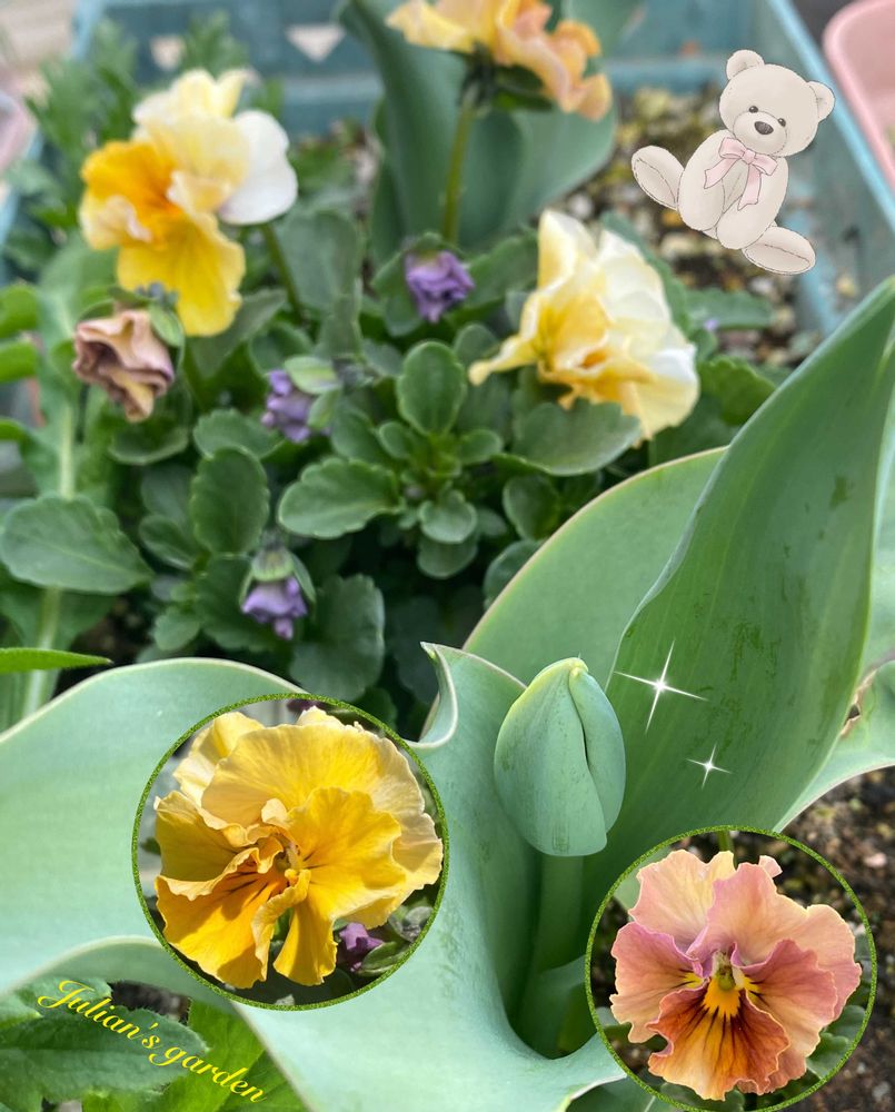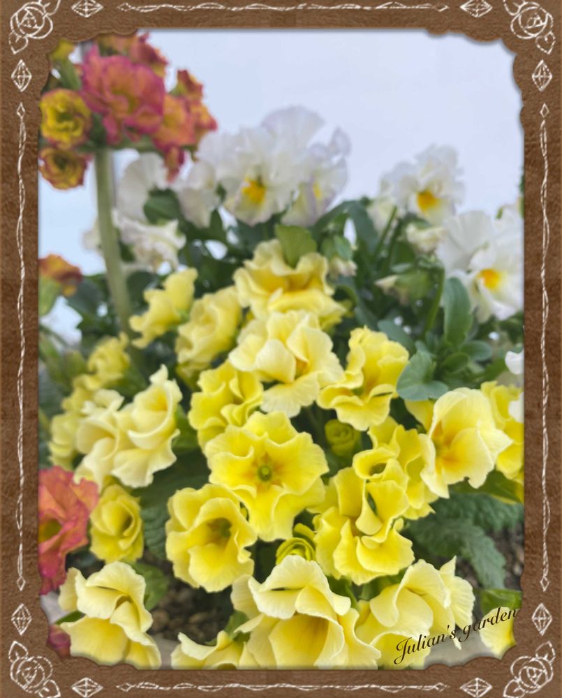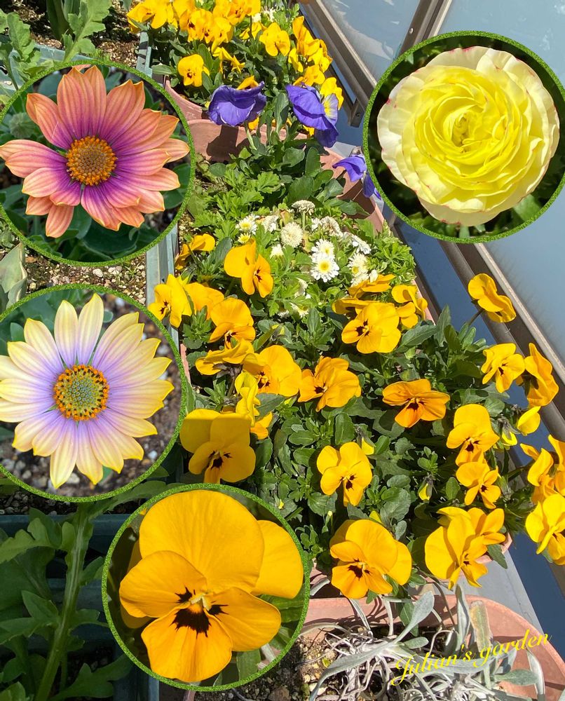 プリムラジュリアン、ビオラのミルフルさん 少しづつ色変有り、黄色いチューリップ予定の蕾💚、おじさん顔のビオラ、ラナンキュラス、黄色とオレンジのオステオスペルマム💛🧡💖