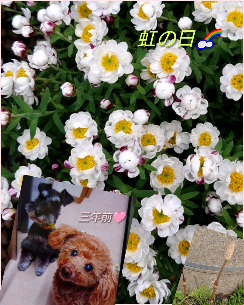 おはようございます🎵庭の花かんざしが 満開でーす🩷散歩で見付けたつくし😌春だわ〜〜🤗三年前の仲良しミント&コタローで虹の日に参加します🎶