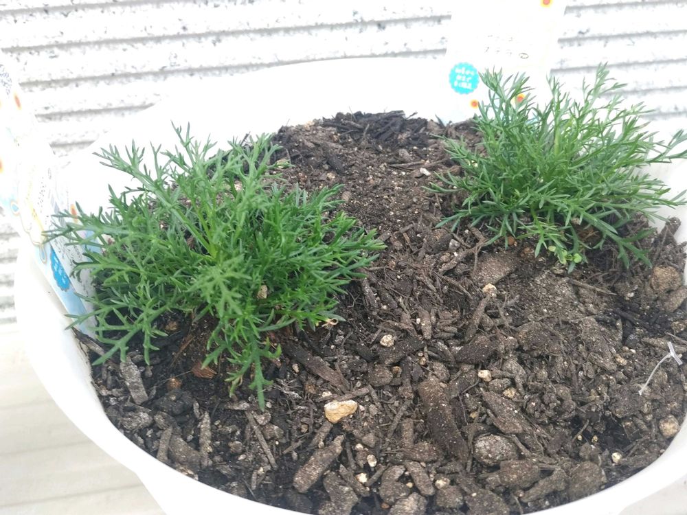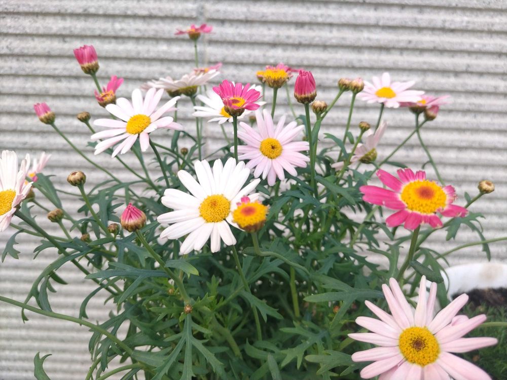 趣味の園芸でやって丈夫なニューサマーデージー。マーガレットとローマンカモミールを掛け合わせた期待がもてる。植え替えてあります。