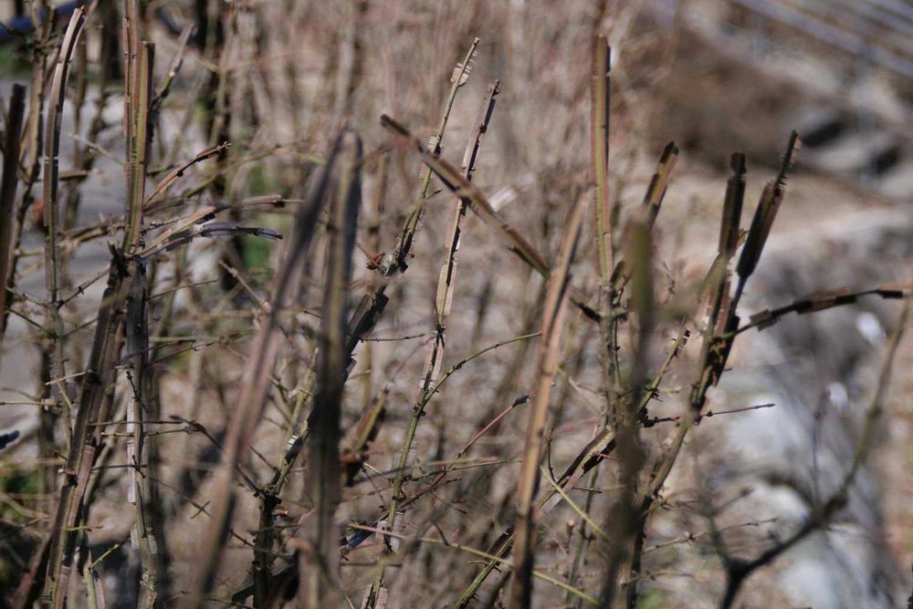 3枚目 翼のある代表選手、ニシキギ(錦木)その年の新しい枝には翼は出来ず(若い翼は見掛けます、色が違いますが) ここは短く剪定された翼だらけでまるで何か武器のように道沿いに並びます。