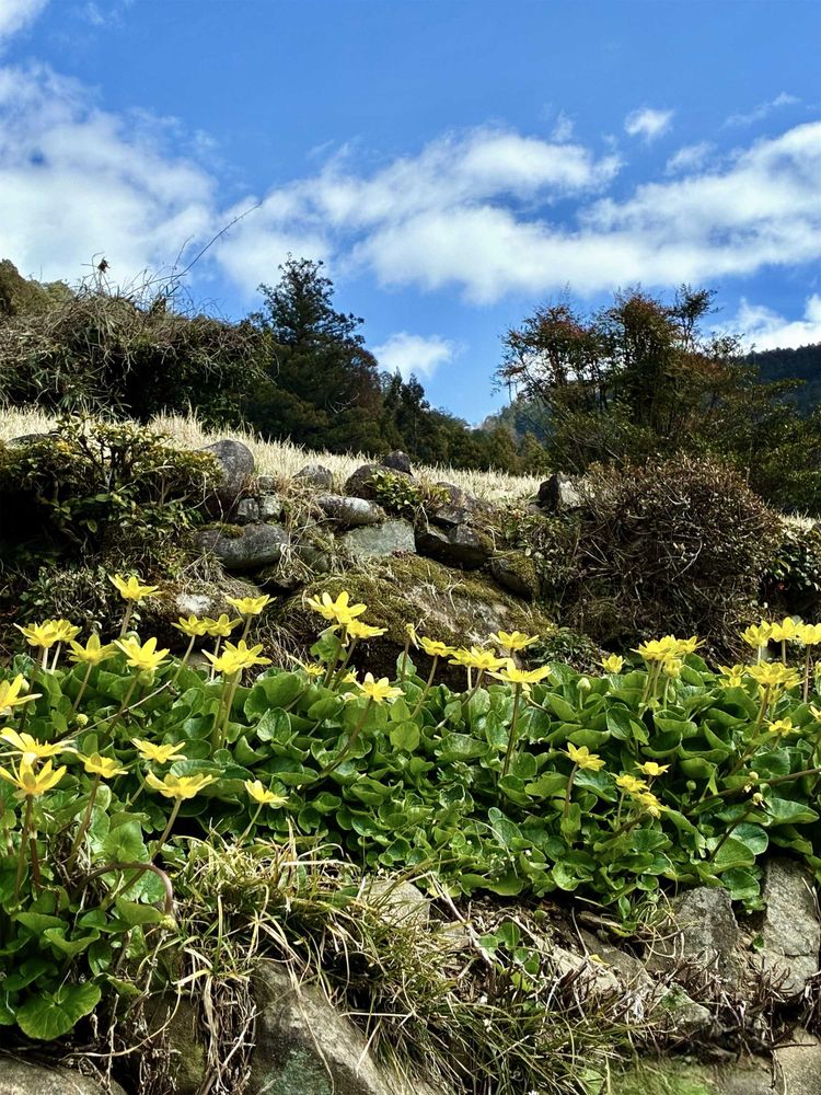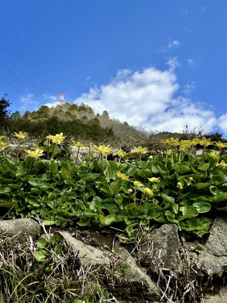 古里の山と空をバックにヒメリュウキンカさん、元気一杯に咲き乱れてて素晴らしいです💮💛💛