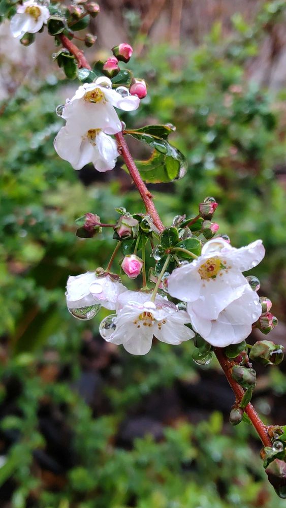 先日冷たい雨の日、雨の雫をまとって小さな花びらを広げた雪柳が、輝いて見えました。