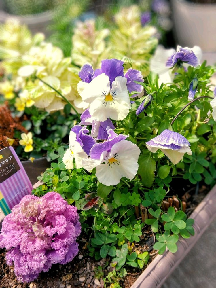 💜💗9cm位のハボタン🌸植え替え でパンジー🩵💙と同居🫶🤭