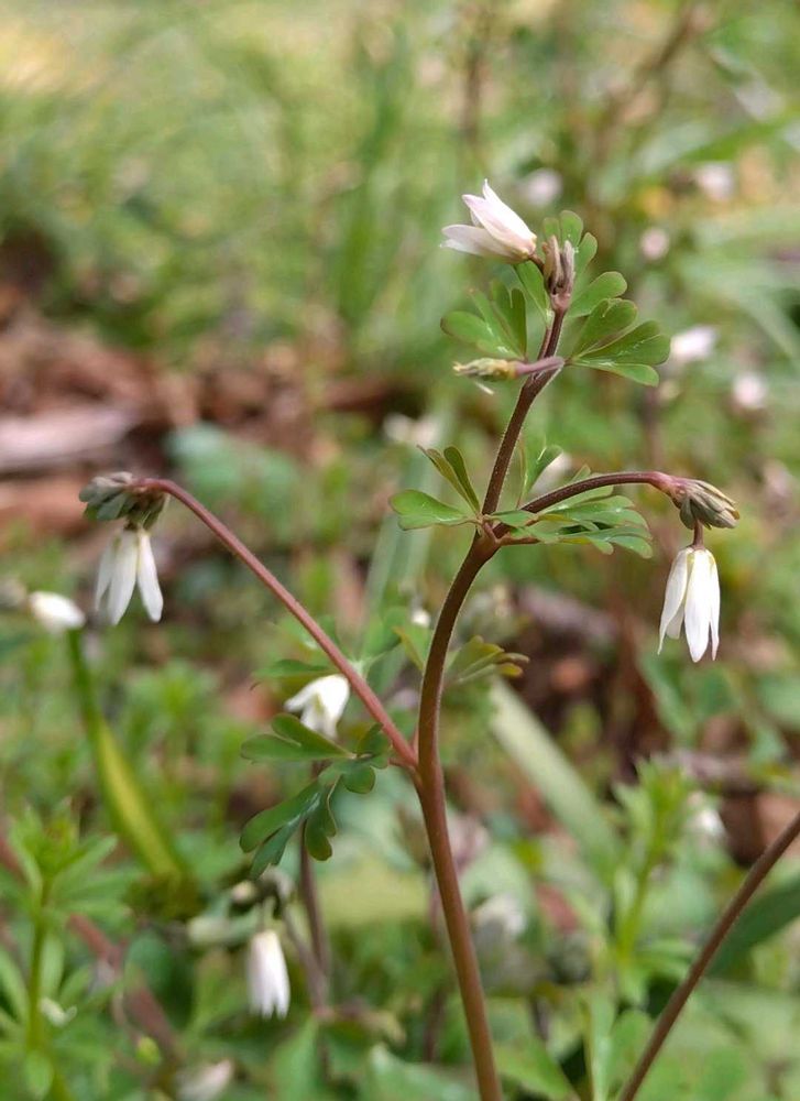 キンポウゲ科ヒメウズ属の多年草。日当たりのよい土手、道端、石垣の間などに生える。根生葉は3出複葉で長い柄がある。小葉は2~3裂し、裂片はさらに浅く2~3裂する。花期は3~5月。オダマキに似た5㎜ほどの小さくてほんのり紫がかった花を下向きに咲かせる。花弁のように見えるのは5枚の萼片で、中心で雄しべを筒状に囲んでいる部分が花弁。果実は袋果で、3~4個が花とは逆に上向きにつく。袋果には種子が10個ほど入り、風に揺れたり雨粒が当たると散布される。