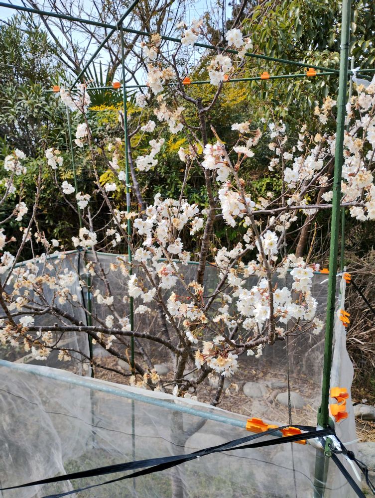 この暖地性サクランボは1本でも実がなります。ヒヨドリに花をついばまれてしまわないように、上部は黒テグスを張り、下部はネットで囲ってあります。