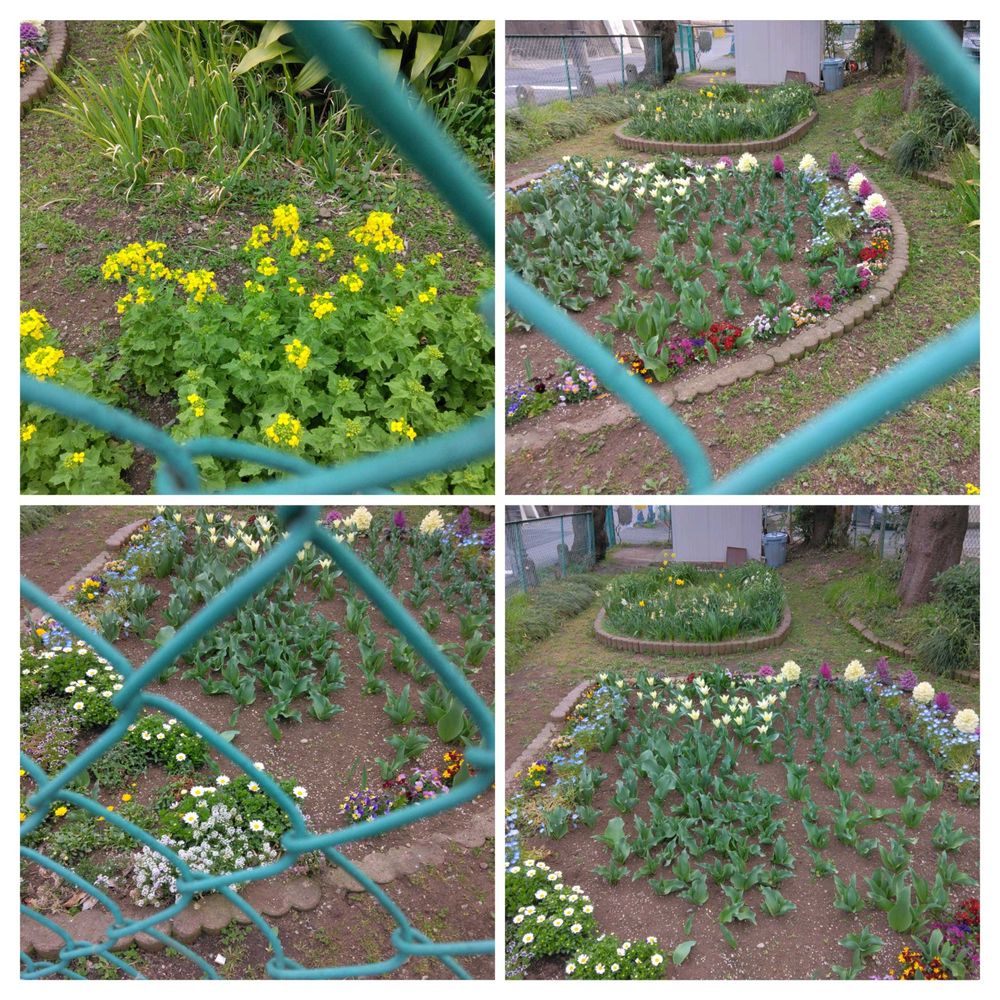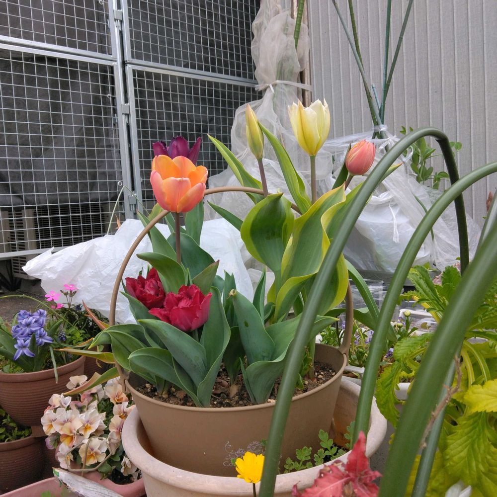 3⃣車道から見たハジープランターと鉢植え バスケットプランターのチューリップが順次開花してきた~